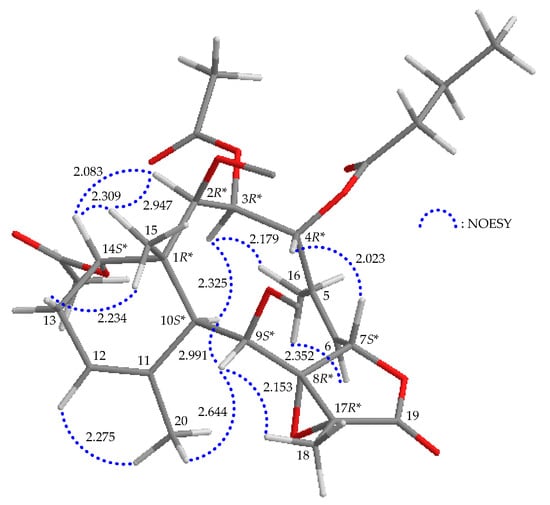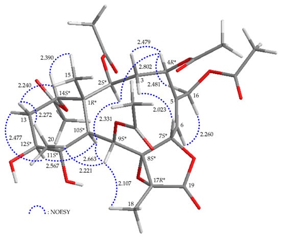 The relative stereochemistry of briarane 1 was established by interpreting the NOESY spectrum in addition to the assistance of the computer-generated modeling structure. The literature review indicated that most naturally isolated briaranes have a β-Me and an α-H placed at C-1 and C-10, respectively []. From the NOESY data of 1 (Figure 3), H3-15 exhibited cross-peaks with H-14 and one of the diastereotopic methylene protons at C-13 (δH 1.67, H-13β) but not with H-10; while H-10 was correlated to H-2, H-9 and H-12, consistent with the α-orientation of OAc-14 and β-orientations of OAc-2, OAc-9 and OH-12, respectively. Furthermore, H3-20 showed a correlation to H-13β and the absence of cross-peaks with H-10 and H-12, suggesting a β-oriented methyl group at C-11. One of the C-3 diastereotopic methylene protons (δH 2.97) exhibited a correlation to H-7 but not to H-2 and H-4, suggesting the β-orientations of this proton and H-7. The other was assigned as H-3α (δH 2.04). H-4 showed a correlation with H-3α, and a greater coupling constant of 12.4 Hz was noted between H-4 and H-3β, demonstrating the α-orientation of H-4 [,] and that the plane between H-4 and H-3β has a dihedral angle of approximately 180°. H-9 correlated to H-10, H3-18 and H3-20, suggesting that H-9 is close to all these protons. In combination with model analysis, Me-18 and 8,17-epoxy group should be placed at β- and α-face in the γ-lactone moiety, respectively. A correlation between H-6 and a proton of the C-16 diastereotopic methylene (δH 5.25) but not with H-7, in addition to a large coupling constant between H-7 and H-6 (J = 8.4 Hz), suggested that the dihedral angle between H-7 and H-6 was nearly 130° [,], revealing the Z-geometry of ∆5. The above interpretation enables the identification the relative configuration of all stereogenic centers of 1 as (1R*,2S*,4R*,7S*,8S*,9S*,10S*,11S*,12S*,14S*,17R*).