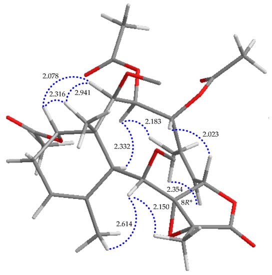Stereoview of 2 and calculated distances (Å) between particular protons that have crucial NOESY correlations.