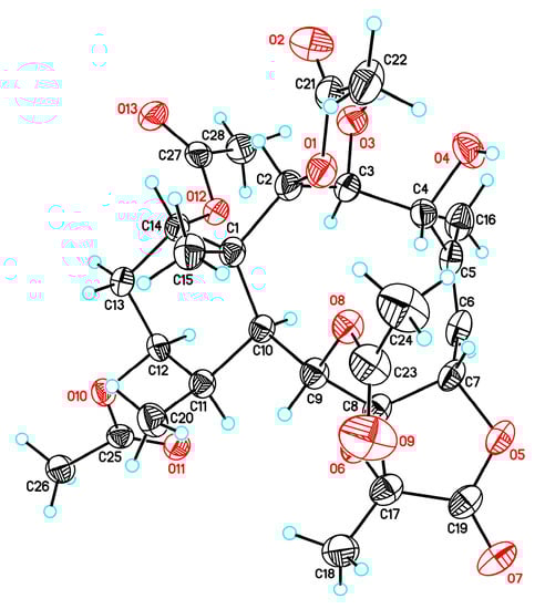 Briavioid A (9) was reported in our previous publication []. Its relative stereochemistry was established through a combination of the NOESY experiment and a single-crystal X-ray diffraction analysis with a molybdenum radiation (Mo Kα, λ = 0.71073 Å) source. However, the configuration obtained from the X-ray analysis with Mo Kα could only be considered absolute when the structure contained at least one heavy atom. Thus, in order to determine the absolute configuration of this compound, the material of briavioid A (9) obtained in previous publication [] was recrystallized, and the diffraction experiment was carried out using a diffractometer equipped with Cu Kα (λ = 1.54178 Å) radiation source (Flack parameter x = 0.01(5)). An Oak Ridge Thermal-Ellipsoid Plot (ORTEP) diagram (Figure 8) showed the absolute configurations of the stereogenic carbons of 9 to be (1R,2R,3S,4R,7S,8S,9S,10S,11R,12S,14S,17R).