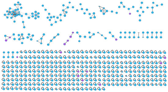 The actinomycetes Nocardiopsis sp. LX-1 was cultured in nutrient broth (NB) and extracted by EtOAc repeatedly to obtain organic crude extracts. Then, the crude extract samples were diluted and subjected to UHPLC-MS/MS analysis to obtain the raw MS/MS data. The obtained MS/MS data were converted into .mzXML format and uploaded to the GNPS platform to obtain the molecular network (Figure 1, https://gnps.ucsd.edu/ProteoSAFe/status.jsp?task=37dd96194c924f6d9daeef62672ba930, accessed on 29 November 2021) of the secondary metabolic profile of the actinomycetes Nocardiopsis sp. LX-1. This was finally visualized by Cytoscape software. The molecular network of the metabolic profile of LX-1 contained 473 nodes and 530 edges, meaning there were 473 compounds annotated by molecular networking in the raw MS/MS data of the actinomycetes crude extracts. The compounds that shared similar MS/MS fragments and similar chemical structures were connected by edges and clustered together into a molecular family. There were 31 molecular clusters (over two nodes) in the LX-1 molecular network, and the maximal cluster contained 33 nodes, meaning 33 compounds with similar chemical structures were in the first molecular cluster (Figure 1). The purple nodes in Figure 1 express compounds annotated by molecular networking and blue nodes mean compounds not identified by molecular networking. Most of the compounds (blue nodes) in the molecular network were unknown after searching in the GNPS database (Figure 1), indicating the crude extracts produced by Nocardiopsis sp. LX-1 might possess abundant new compounds.