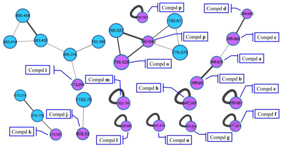 Figure 2. Compounds ap identified by molecular networking from Nocardiopsis sp. LX-1. The purple nodes are compounds annotated by molecular networking and blue nodes are compounds not identified by molecular networking. The numbers in nodes mean precursor mass of compounds. The letters ap in bold format represent different recognized compounds. The size of the nodes decided by precursor intensity represents the quantity of the compounds.