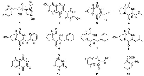 Compound 12 was obtained as a pale yellow powder. The molecular formula of C7H7O2N was determined by HR-ESI-MS (Figures S50 and S51) with the [M − H] peak at m/z 136.0393 (calculated for C7H6O2N, 136.0404), and [M + H]+ peak at m/z 138.0554 (calculated for C7H8O2N, 138.0550). The NMR spectra of 12 displayed six phenyl-carbon signals at δC 109.7, 151.2, 116.6, 135.2, 116.9, and 132.3, along with four phenyl-hydrogen signals at δH 6.67 (1H, dd, 7.1, 1.0), 7.30 (1H, ddd, 8.3, 7.1, 1.6), 6.66 (1H, dd, 8.3, 1.0), and 7.92 (1H, dd, 8.3, 1.6), and one carboxyl signal at δC 173.6 (Table S5) indicated that 12 was 2-aminobenzoic acid [44].2.3. Antimicrobial Activities of Compounds 112