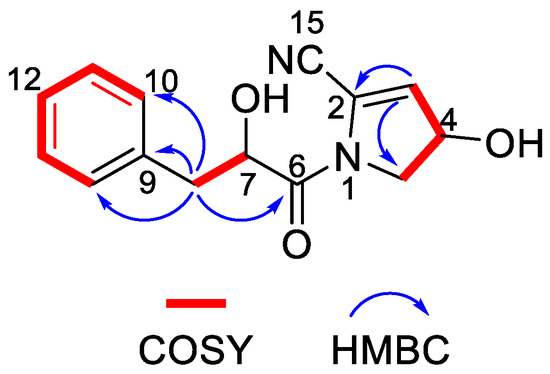Nocarpyrroline A (1) was obtained as an amorphous white powder. Its molecular formula was determined as C14H14O3N2 by HR-ESI-MS with the [M−H] peak at m/z 257.0939 (calculated for C14H13O3N2, 257.0932) (Figure S7) and [M + H]+ peak at m/z 259.1080 (calculated for C14H15O3N2, 259.1077) (Figure S8), containing nine degrees of unsaturation. The five aromatic proton signals at δH 7.09–7.04 (1H, m), 7.24–7.20 (1H, m), 7.20–7.17 (1H, m), 7.24–7.20 (1H, m), and 7.09–7.04 (1H, m) in 1H NMR data of 1 (Table 2 and Figure S1), combined with the six 13C NMR signals at δH 135.6 C, 131.0 CH, 129.3 CH, 128.2 CH, 129.3 CH, 131.0 CH (Table 2 and Figure S2), indicated that there was a phenyl group in 1. The HMBC correlations from H-8 to C-9/C-10/C-14 proved the phenyl group was linked at C-8 (Figure 6). The 1H NMR, 13C NMR, HSQC and HR-ESI-MS spectra (Figures S1–S3 and Figure S7) of 1 displayed one unsaturated quaternary carbon at δC 135.2, one unsaturated methine at δH 5.73 (1H, d, 2.7 Hz), δC 119.6, one oxygenated methine at δH 4.71 (1H, ddd, 8.2, 3.5, 2.7 Hz), δC 70.2, and one methylene at δH 3.72 (1H, dd, 13.6, 8.2 Hz), 3.62 (1H, dd, 13.6, 3.5 Hz), and δC 54.5, demonstrated a pyrroline ring with a hydroxyl substituent group in 1. The COSY cross-peaks of H-3/H-4 and H-4/H-5, and the HMBC correlations from H-3 to C-2 and H-3 to C-5 further proved the existence of a pyrroline ring in 1 (Figure 6). One unsaturated quaternary carbon at δC 164.2 showed there was a carbonyl group in 1. The HMBC correlation between H-8 and C-6, and the COSY cross peak of H-7/H-8, revealed the carbonyl group was in the location of C-6 (Figure 6). The high field shift of the C-6 carbonyl group indicated the amide linkage between C-6 and N-1 (Table 2). The IR absorption band at 2253 cm–1 (Figure S9), combined with the molecular formula of C14H14O3N2 and the nine degrees of unsaturation suggested that there was one cyano group in 1. The high field shift of C-2 and low field shift of C-3 indicated that the cyano group was linked at C-2 (Table 2). Thus, the plane structure of 1 was established unambiguously as shown in Figure 4. The NOESY spectrum was measured to determine the relative configuration of 1; however, the NOESY cross-peaks were not clear enough to identify the relative configuration of 1. The absolute configuration of 1 was attempted to determine by the modified Mosher’s method. Unfortunately, it was failed due to the limited quantity of 1.