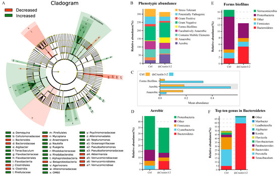 Intestinal microbiota analysis in shrimp after LvCrustin I-2 knockdown. (A) LEFse analysis of the intestinal microbiota of the control group and dsLvCrustin I-2 group. The green and red colors indicate increased and decreased bacteria in different taxa, respectively. The “Decreased” indicate the bacteria have higher proportion in the control group than that in the dsLvCrustin I-2 group. The “Increased” indicate the bacteria have higher proportion in the dsLvCrustin I-2 group than that in the control group. (B) Predicted functional profile of intestinal microbial community was classified into nine phenotypes. (C) Mean abundance of phenotypes at p < 0.05. (D) Relative abundance of different phyla in biofilm-forming phenotype. (E) Relative abundance of different phyla in aerobic phenotype. (F) Top ten genera in Bacteroidetes.