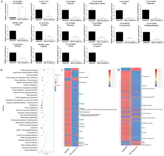 (A) Real-time quantitative PCR (qRT-PCR) analysis of candidate genes. The expression levels of these genes are presented as mean ± S.D. The gene 18S rRNA was used as the reference gene. The expression levels are all obtained from three biological replicates. Star (*) indicates statistical difference between dsLvCrustin I-2 group and dsEGFP group (One-way ANOVA, p < 0.05). The accession numbers of these selected genes are shown in Tables S3 and S4. (B) KEGG pathway enrichment analysis. “GeneNumber” represents the number of DEGs enriched in certain pathways. “p value” is the value obtained via hypergeometric test to define the significance of enriched pathways, and its colors represent the significance from low (blue) to high (red). (C) The DEGs involved in intestinal epithelial barrier integrity. (D) The DEGs involved in immune and oxidative stress. The colors represent the relative expression levels from low (blue) to high (red).