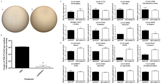 Detection of intestinal epithelial barrier and immune-related genes in shrimp after removing intestinal microorganisms and LvCrustin I-2 knockdown. (A) Spread plates of intestine homogenate of shrimp. (a) Intestine homogenate of PBS buffer-treated shrimp. (b) Intestine homogenate of antibiotic-treated shrimp. (B) Total viable bacteria counts in intestines of shrimp treated with PBS buffer or antibiotics. The data were obtained from three independent repeats with three individuals per sample. Significant differences between treatment and control groups are labeled with a star at p < 0.05. (C) qRT-PCR analysis of intestinal epithelial barrier-related genes. (D) qRT-PCR analysis of immune-related genes. The expression levels of these genes are presented as mean ± S.D. The gene 18S rRNA was used as the reference gene. The expression levels were all obtained from three biological replicates. Star (*) indicates statistical difference between the dsLvCrustin I-2 group and dsEGFP group (One-way ANOVA, p < 0.05).