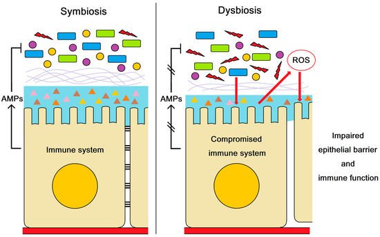 According to the above evidence, we concluded that AMPs could maintain intestinal health and resist pathogen infection by regulating intestinal microbiota balance (Figure 5). The dysbiosis of intestinal microbiota induced excessive ROS production and impaired the epithelial barrier and immune function in shrimp, which facilitated the V. parahaemolyticus invasion. The present study revealed the molecular mechanism by which AMPs modulate the outbreak of AHPND in shrimp.