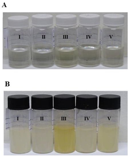 Organoleptic evaluation of the cosmetic formulations. (A) F1, placebo; and (B) F2—with 0.5% (w/w) marine collagen as an active ingredient, when stored, for one month: (I) at room temperature (22 ± 2 °C), (II) at refrigerated temperature (4 ± 2 °C), (III) at high temperature (40 ± 2 °C) or (IV) exposed to sunlight; and (V) when submitted to temperature cycles.
