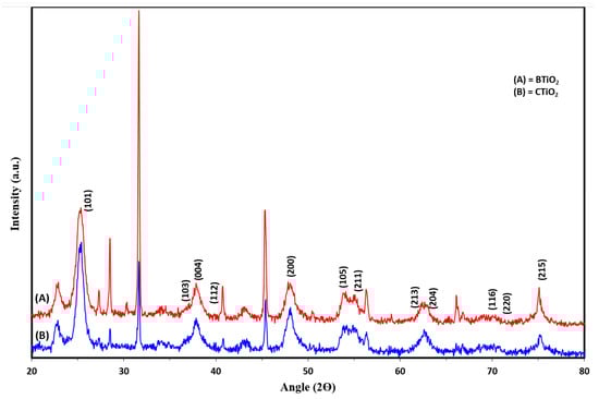 XRD patterns for: (A) BTiO2 and (B) CTiO2.