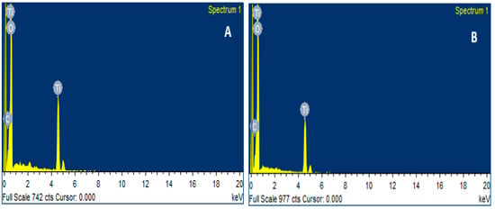 The EDS spectra of the two catalysts are displayed in Figure 3. Well defined peaks for Ti, O, and C elements are shown for both CTiO2 and BTiO2. The elemental composition of the catalysts determined through the EDS analysis is shown in Table 1. The presence of carbon 13.60 atomic% for BTiO2 and 16.91 atomic% for CTiO2 nanoparticles reveal the incorporation of carbon into the lattice of both catalysts during the synthesis process via the addition of natural marine extract containing organic compounds. To incorporate C atoms into the TiO2 lattice, three possible theatrical scenarios were proposed by Di Valentin and his coworkers []. Firstly, the substitution of a lattice oxygen with a carbon; secondly, the replacement of Ti atoms by C atoms. Lastly, stabilization of carbon at an interstitial position.