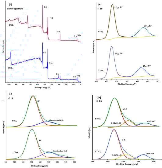 X-ray photoelectron spectroscopy (XPS) for (A) survey, (B) Ti 2p, (C) O 1S, and (D) C 1S of BTiO2 and CTiO2.