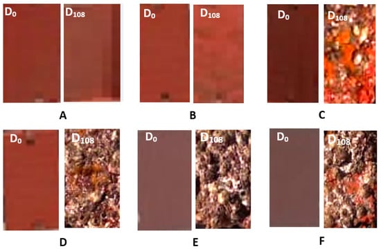 Photographic pictures of the coated panels with: (A) BTP; (B) CTP (C) LTiO2, (D) HTiO2, and (E) STiO2, and (F) commercial paint, from the beginning (Day 0) until the end of immersion period (Day 108).