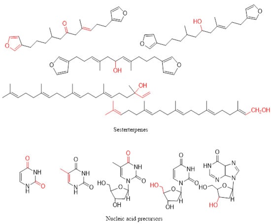 Secondary metabolites isolated from Carteriospongia foliascens (some selected active functionalities are coloured red).