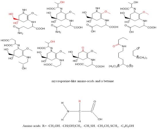 - Orfanoudaki, M.; Hartmann, A.; Miladinovic, H.; Ngoc, H.N.; Karsten, U.; Ganzera, M. Bostrychines A-F, six novel mycosporine-like amino-acids and a novel betaine from the red alga Bostrychia scorpioides. Mar. Drugs 2019, 17, 356. [Google Scholar] [CrossRef]