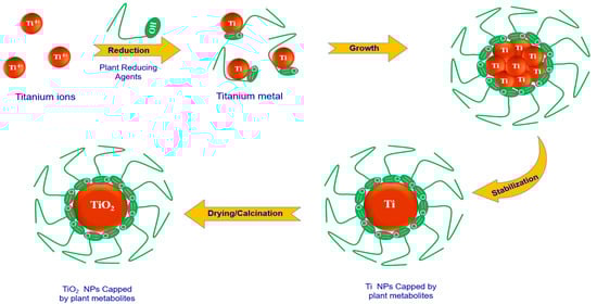 Generally, the biosynthesis of plant-based metallic nanoparticles can be suggested to be accomplished in three consecutive phases: reduction phase, growth phase, and stabilization phase []. The mechanism of marine extract (alga/sponge) mediated synthesis of TiO2 nanoparticles can be described by considering these phases as follows (Figure 8):