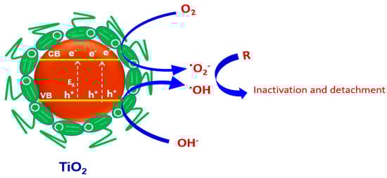 Figure 9 illustrates the simplified antifouling mechanism using the as-synthesized catalysts. When catalyst (BTiO2 or CTiO2) is irradiated with light of energy (hν) ≥ its band gap energy (Eg = 2.9 eV), hole-electron pairs are produced (Equation (2)), as well as the remaining holes () in the valence band and the electrons () in the conduction band. Consequently, two types of reactions can occur: electron-mediated reduction and oxidation reaction by holes. The positively charged holes () capture the surface OH− groups as well as interact with water molecules to generate the reactive hydroxyl radicals (•OH). Meanwhile, the dissolved oxygen molecules are reduced by the photogenerated electrons () to form superoxide radicals , which can either directly degrade the attached organic molecules (R) adsorbed onto the photocatalyst surface which cause fouling (Equation (8)), or via multistep reactions, and reactions with H2O to further initiate the generation of strong oxidizing hydroxyl radicals (•OH) (Equations (5)–(7)). The generated reactive •OH radicals react with organic molecules ((Equation (8)) [,], leading to inactivation of fouling activities.