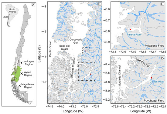 The southern coast of Chile, also known as the Chilean Patagonia (41 to 55° S), constitutes one of the most extensive fjord and channel systems in the world (Figure 1). This system has a rugged bathymetry, dissected coastline, and strong but highly variable water column stratification. Marked salinity gradients exhibit seasonal and latitudinal patterns determined by heavy riverine inflow from ice melting in late spring (November–December) and persistent rainfall with an average of 2700 mm y−1 and up to 5000 mm in exceptional years [72,73]. Summer heating breaks the winter–spring thermal inversion and generates stronger thermohaline gradients [59].
