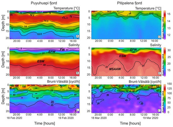 Vertical distribution (0–20 m) every hour of (A,D) Temperature (°C); (B,E) Salinity and (C,F) Brunt–Väisälä frequency at the fixed sampling station in PUY (left panels) and PIT (right panels) fjords during the 24 h surveys in February and March 2020, respectively. Acronyms for water layers in the fjords stand for: FW (S < 11); EFW = Estuarine Fresh Water (S = 11–21); ESW= Estuarine Salty Water (S = 21–31); MSAAW= Modified Subantarctic water (S > 31) [52].