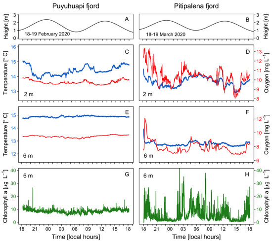 Physical–chemical conditions recorded at the fixed sampling station in PUY (left panels) and PIT (right panels) fjords during 24 h, in February and March 2020, respectively. Tidal amplitude (A,B); Temperature (blue line) and dissolved oxygen (red line) measurements at 2 m (C,D) and 6 m depth (E,F); Chlorophyll-a recorded at 6 m (G,H).
