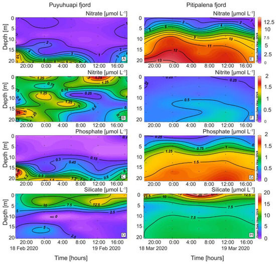 Vertical distribution (every 6 h) of dissolved nutrients at the fixed station in PUY (left panels) and PIT (right panels) fjords during 24 h sampling in February and March 2020, respectively. (A,E) Nitrate; (B,F) Nitrite; (C,G) Phosphate; (D,H) Silicate.