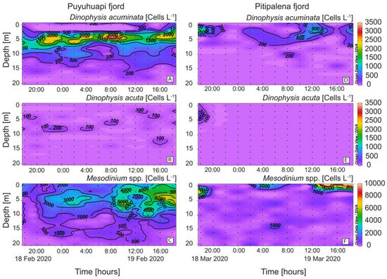 High cell densities (>3 × 103 cells L−1) of D. acuminata were found in PUY within the warmer (14.5–15 °C) sub-surface (2–6 m) layer of Estuarine Salty Water (ESW; Figure 5A) and the cell maximum (3.8 × 103 cells L−1), on February 19 at 08:00 h and 4 m depth, was at the interface between the EFW and the ESW water layers (Figure 5A). In PIT, D. acuminata cell maximum (1.5 × 103 cells L−1) was found at 2 m depth within the surface layer (0–4 m), 13.4–14.0 °C on March 18 at 18:00 h, also in the interface between EFW (S = 11–21) and ESW (S = 21–31) (Figure 5D). Very low densities of D. acuta were observed in both fjords, with cell maxima not exceeding 2 × 102 cells L−1 in PUY and under detection levels in PIT except during the first few hours of sampling (Figure 5B,E). Mesodinium species, putative prey of Dinophysis, were abundant in both fjords throughout the 24 h sampling. In PUY, Mesodinium spp. were found from 0 to 20 m at night and aggregated in the top 8 m during the day (max. of ~ 6.6 × 103 cells L−1 at 16:00 h) (Figure 5C). In PIT, higher densities of Mesodinium (>104 cells L−1) aggregated in the top (0–4 m) layer and the maximum was observed in the same time–depth window as in PUY (Figure 5F).
