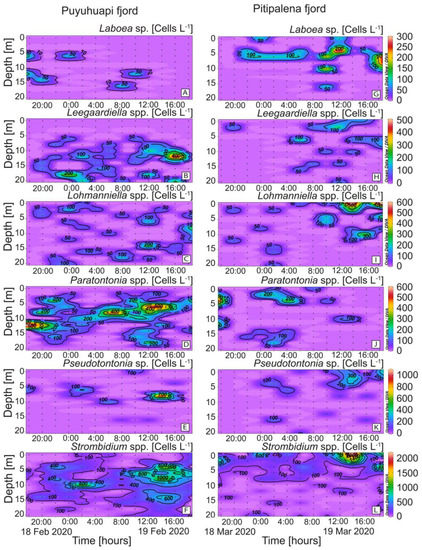 Vertical distribution (every 2 h) of potential plastid-bearing micro-ciliate prey for Dinophysis species: (A,G) Laboea sp.; (B,H) Leegaardiella spp.; (C,I) Lohmanniella sp.; (D,J) Paratontonia spp.; (E,K) Pseudotontonia sp.; (F,L) Strombidium spp. at the fixed station in PUY (left panels) and PIT (right panels) fjords during the 24 h studies in February and March 2020, respectively. Note the different scales between panels.