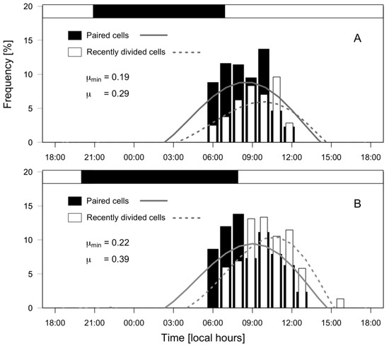 Distribution of frequencies (%) of paired (dividing, black bars) and recently divided (white bars) cells of D. acuminata during 24 h monitoring of cell cycle stages at PUY (A) and PIT (B) fjords. Top horizontal bar indicates the dark hours (between sunset and sunrise).