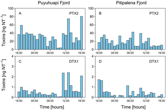 Liquid chromatography Coupled to High Resolution Mass Spectrometry (LC-HRMS) analysis of net tow extracts showed that DTX1 and PTX2 were present in most samples containing D. acuminata in both fjords. OA was not detected. Analyses revealed a chromatographic peak with a retention time of 4.79 min with an [M-H]- ion 817.4762 m/z. The fragmentation spectrum showed the major product ion 255.1236 m/z that confirms the presence of DTX1 (Figure A1). DTX1 was detected in 14.1% of the samples from PUY (maximum of 2.405 ng DTX1 NT−1 (net tows) on February 19, at 13:00 h) and in 34.6% of those from PIT (maximum of 1.718 ng DTX1 NT−1 on March 18, at 18:00 h) (Figure 8). The second chromatographic peak detected at 7.48 min with a parent mass [M+NH4]+ 876.5090 m/z corresponded to PTX2. The characteristic MS/MS fragment confirmed the presence of this toxin at m/z 841.4730, 823.4620, 805.4518, and 787.4406 m/z (Figure A1). PTX2 was detected in 75.6% of water samples from the PUY fjord with a maximum of 80.480 ng PTX2 NT−1 on February 19, at 18.00 (Figure 8), and in 87.2% of those from PIT where the maximum detected was 42.161 ng PTX2 NT−1 on March 19, at 07:00 (Figure 8).