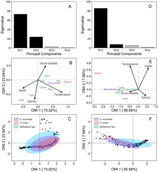 Outlying Mean Index (OMI) analysis of Dinophysis acuminata, Dinophysis acuta, and co-occurring plastid-bearing micro-ciliates at the fixed station in PUY (left panels) and PIT (right panels) in 18–19 February and 18–19 March 2020, respectively. (A,D) Bar plot of the eigenvalue in percentages of the total sum. Black bars are the chosen factorial axis PC1 (OMI1) and PC2 (OMI2); (B,E) Species’ realized niche positions of D. acuminata (purple), D. acuta (pink), their putative prey Mesodinium spp. (light blue), and other plastid-bearing ciliates (dark blue) on OMI1 and OMI2 with the canonical weights of environmental variables (see Table 1 for codes); (C,F) Realized niche breadth of D. acuminata, D. acuta, and Mesodinium spp. within the environmental space. Black dots represent the samples.