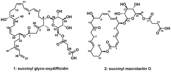 Structures of succinyl glyco-oxydifficidin (1) and succinyl macrolactin O (2).