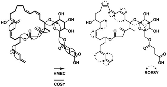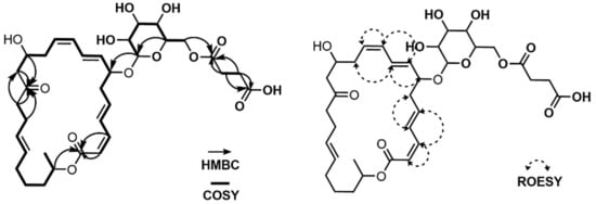 COSY, HMBC and ROESY correlations of succinyl macrolactin O (2).