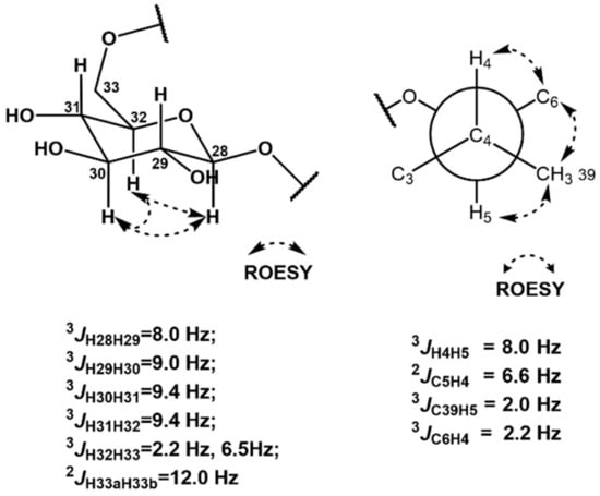 J coupling constant values and ROESY correlations of the sugar and C4–C5 moieties.