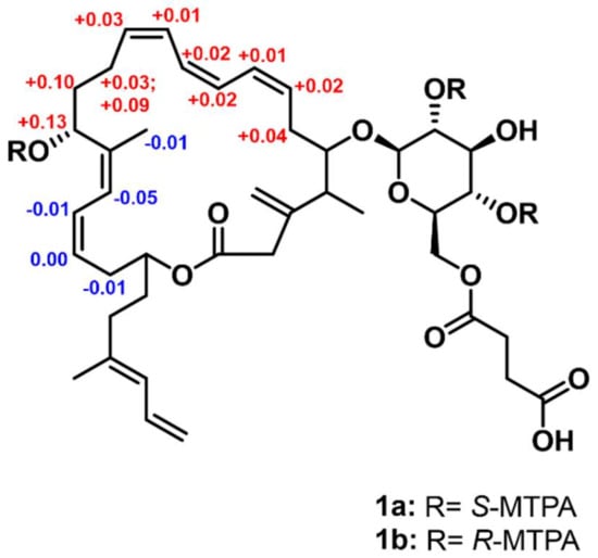 The absolute configuration of the stereogenic center at C-15, which bears a secondary alcohol, was determined using the modified Mosher’s method [20]. The hydroxy groups at C-15 were esterified with R- and S-α-methoxy-α-(trifluoromethyl) phenylacetyl chloride (MTPA-Cl) to the tri-S- and R-MTPA esters (1a and 1b). The calculated 1H-NMR spectroscopic ΔδS−R values established the absolute configuration as 15R (Figure 4 and Figures S8–S11).