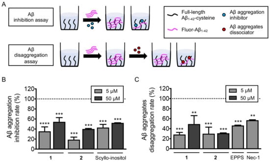 We further examined the compounds ability to dissociate pre-formed Aβ aggregates. In this assay, compounds were added to the plate after on-plate oligomer and fibril formation was induced [26]. Briefly, fluorescent Aβ1-42 was added to the Aβ1-42-immobilized plate and incubated for 8 h at 37 °C. Then, each compound in two concentrations, 5 and 50 µM, was treated to the plate and incubated for additional 24 h at RT (Figure 6A). Previously reported Aβ aggregate dissociators, 4-(2-hydroxyethyl)-1-piperazinepropanesulphonic acid (EPPS) [28] and 5-(1H-indol-3-ylmethyl)-3-methyl-2-thioxo-4-imidazolidinone (Necrostatin-1, Nec-1) [29], were used as positive controls. The plate was washed after the incubation step, and we measured the levels of the remaining fluorescent Aβ1-42. Fluorescent signal of wells without fluorescent Aβ1-42 treatment was regarded as 100% disassociation rate [26]. As a result, both compounds reversed Aβ aggregation significantly; 1 by 28.46% (at 5 µM) and 49.27% (at 50 µM), and 2 by 30.04% (at 5 µM) and 31.02% (at 50 µM), when the control compounds dissociated pre-formed aggregates by 46.42% (EPPS at 5 µM) and 59.94% (Nec-1 at 5 µM) (Figure 6C).