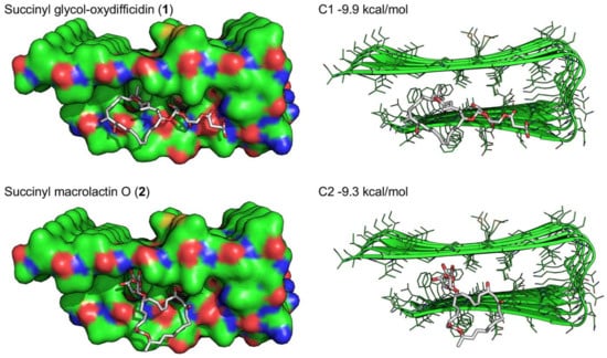 Docking simulations of succinyl glyco-oxydifficidin (1) and succinyl macrolactin O (2) docking into the U-shaped oligomeric Aβ (1-42) structure (PDB ID: 2BEG).