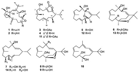 In the last decades, we systematically carried out chemical and biological studies on South China Sea marine fauna and flora [36]. As a result, numerous terpenes with complex structures, some of which possessed unprecedented carbon frameworks, were found from the genus Sarcophyton [20,37,38]. During our continuous research, we frequently encountered the soft coral Sarcophyton trocheliophorum, one productive species belonging to the above-mentioned genus. Previously, our group disclosed a vast array of diterpenes with four skeletons, and these metabolites showed a broad spectrum of pharmacological activities such as protein tyrosine phosphatase 1B (PTP1B) inhibitory, antitumor, antibacterial and neuroprotective activities [39]. It was interesting to notice that the chemical profiles of diterpenes from the title soft corals varied upon temporal variations and geographical distributions. The samples collected in Yalong Bay, Hainan Island, South China Sea in February 2006 yielded diterpenes with an unprecedented carbon framework [37] together with sarsolenane, capnosane, and cembrane skeletons [39]. However, the specimen collected in the same water but in May 2006 only yielded cembrane diterpenes [40]. Of more interest, the soft corals collected from another different region, Ximao Island, South China Sea, merely afforded the cembranoids [41]. These findings probably reflected the existence of different metabolic processes in different seasons and inhabiting environments, which needs to be further investigated.