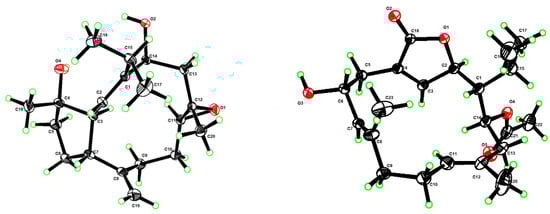 The frozen animals were cut into pieces and extracted exhaustively with acetone. Then an Et2O-soluble portion of the acetone extract was repeatedly chromatographed over silica gel, Sephadex LH-20, and RP-HPLC to yield six new compounds 1, 3, 5–8, and four known analogs 2, 4, 9, and 10 (Figure 1). The known compounds were readily identified as sarcophyolide D (2) [42], sarcophytonolide H (4) [43], sarcophytrol O (9) [44], sinulaflexiolide I (10) [45], respectively, based on the comparison of their NMR spectral and specific optical data with those reported in the literature. In our previous work [43], the absolute configuration of sarcophytonolide H (4) was established by the modified Mosher’s method. In the present study, its crystals were obtained, which were suitable for X-ray diffraction experiment with Cu Kα (λ = 1.54178 Å) radiation. The X-ray diffraction analysis allowed the assignment of the absolute configuration of 4 as 1R,2R,6R,14S (Flack parameter: –0.03 (9)) (Figure 2, Table S2, CCDC 2205721), which was consistent with our previous study.