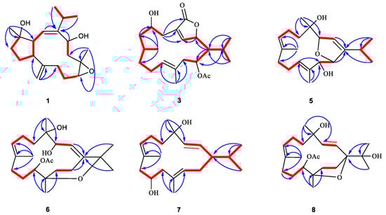 The selected key 1H–1H COSY (red lines) and HMBC (blue arrows, from 1H to 13C) correlations of compounds 1, 3, 5–8.
