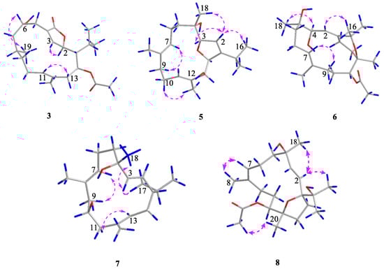 The selected key NOESY (pink dashed lines, from 1H to 1H) correlations of compounds 3, 5–8.