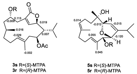 The protonated molecule peak at m/z 343.2237 ([M + Na]+, calcd. for C20H32O3Na, 343.2244) displayed in the HRESIMS spectrum of sartrocheliol C (5) revealed that compound 5 had the molecular formula C20H32O3, demonstrating the presence of an additional oxygen atom with respect to that of a dihydrofuran cembranoid 12 [46]. The IR spectrum of 5 showed the presence of olefinic (νmax 3726 cm−1) and hydroxyl (νmax 3441 cm−1) groups. A careful analysis of its NMR spectra revealed that the NMR spectroscopic features of 5 (Table 1 and Table 2) highly resembled those of 12. In fact, the main difference between compounds 5 and 12 was that the CH2-13 in 12 was hydroxylated in 5. The presence of a hydroxyl group at C-13 was supported by the dramatically down-field shifted carbon chemical shift (ΔδC 56 ppm), and further confirmed by the diagnostic HMBC correlations of from H-11 (δH 5.32) to C-13 (δC 79.67) and from H3-20 (δH 1.56) to C-13 (Figure 3). The cross-peak of H3-18 (δH 1.00)/H-2 (δH 5.51) observed in the NOESY spectrum of 5 (Figure 4) together with the small coupling constant (1.4 Hz) between H-2 and H-3 (δH 4.66) suggested the same orientation of H3-18 and H-3. Moreover, the coupling constant (4.6 Hz) between H-13 (δH 4.29) and H-14 (δH 4.84) indicated these two protons were cis-orientated. Whereas the lack of the NOE correlation between H-3 and H-14 revealed the trans-orientation of these two protons of the 2,5-dihydrofuran ring. Thus, the relative configuration of 5 could be assigned as 3R*,4R*,13S*,14S* based on the extensive analysis of the NOESY spectrum. Meanwhile, the relative configuration of 5 could also be elucidated via QM-NMR protocol by using the DP4+ method, which has become one of the most popular and reliable methods to find the most likely structure from a set of putative candidates [34,47]. Four possible isomers (2R*,3R*,13R*,14S*)-5a, (2R*,3R*,13S*,14S*)-5b, (2R*,3S*,13R*,14S*)-5c and (2R*,3S*,13S*,14R*)-5d (Table S3) were subjected to QM-NMR calculations. As a result, the experimental NMR data of compound 5 gave the best match for 5b, with 100% probability (Figure 7, Table S4). Herein, the assigned relative configuration 3R*,4R*,13S*,14S* was consistent with the observations deduced from the NOESY spectrum. As there was a secondary hydroxyl group at C-13, the modified Mosher’s method was applied. The resulting distribution pattern of observed ΔδH(S-R) values (Figure 5) established the absolute configuration R for C-13 in 5. Subsequently, the absolute configuration of 5 could be assigned as 3S,4S,13R,14R.