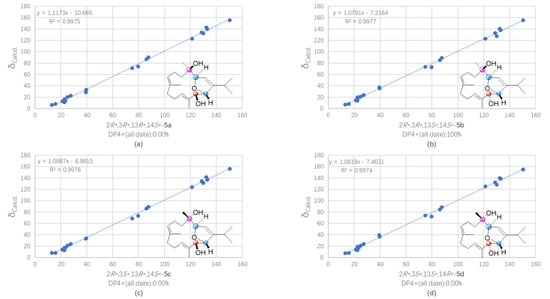Regression analysis of experimental vs. calculated 13C NMR chemical shifts of (a) (2R*,3R*,13R*,14S*)-5a, (b) (2R*,3R*,13S*,14S*)-5b, (c) (2R*,3S*,13R*,14S*)-5c, and (d) (2R*,3S*,13S*,14R*)-5d at the PCM/mPW1PW91/6-31 + G** level, using the DP4+ method.