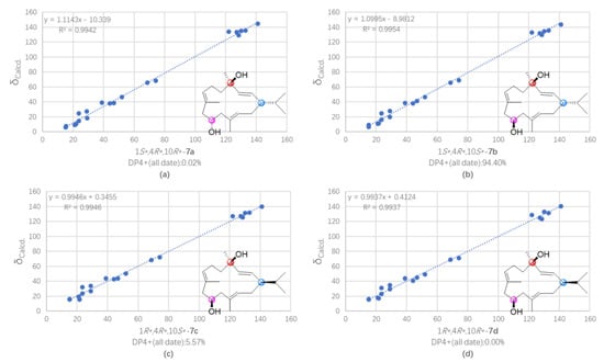 Regression analysis of experimental vs. calculated 13C NMR chemical shifts of (a) (1S*,4R*,10R*)-7a, (b) (1S*,4R*,10S*)-7b, (c) (1R*,4R*,10S*)-7c, and (d) (1R*,4R*,10R*)-7d at the PCM/mPW1PW91/6-31 + G** level, using the DP4+ method.