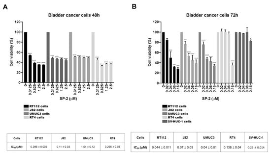 SP-2 selectively suppressed cell viability in bladder cancer (BC) cells. BC cells (RT-112, J82, UMUC3, and RT4) and normal uroepithelial cells (SV-HUC-1) were treated with different concentrations of SP-2 for 48 h (A) and 72 h (B), and cell viability was determined through MTT assay. * p < 0.05, *** p < 0.001, and **** p < 0.0001 compared with control group.