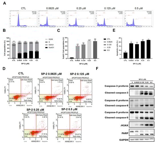 SP-2 induced accumulation of cells in the sub-G1 phase and apoptosis in RT-112 cells. (A–C) SP-2 induced sub-G1 cell population in RT-112 cells. Cells were treated with SP-2 at different concentrations for 48 h then were stained with PI, and cell cycle distribution was detected through flow cytometry (A). Quantitative data (B,C) are based on flow cytometry histograms and are presented as mean ± S.D. (D,E) SP-2 induced annexin-V-positive apoptotic cells in RT-112 cells. Quantitative data of apoptotic cells are presented as mean ± S.D. (E). Cells were treated with SP-2 at different concentrations for 48 h and stained with Annexin V/7-AAD. Apoptotic cells were detected through flow cytometry. (F) SP-2 increased levels of the cleaved forms of PARP; caspase 3, 8, and 9; and γH2AX in a concentration-dependent manner. Cells were treated with the indicated concentrations of SP-2 for 48 h, and cell lysates were immunoblotted using the indicated antibodies. * p < 0.05, ** p < 0.01, *** p < 0.001, and **** p < 0.0001 compared with control group.