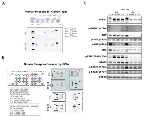 The effects of SP-2 on the phosphorylation profiles in RT-112 cells. (A,B) SP-2 affected the phosphorylation of various receptor tyrosine kinases (RTKs) (A) and protein kinases (B) in RT-112 cells. Cells were treated with SP-2 (0.5 μM) for 36 h, and cell lysates were applied to phosphoprotein array analysis. Protein dots in the blue box indicate increased phosphorylation, and protein dots in the red box indicate decreased phosphorylation after SP-2 treatment. (C) SP-2 significantly downregulated p-FGFR3 and its downstream signaling pathways. Cells were treated with different concentrations of SP-2 for the indicated times, and cell lysates were immunoblotted using the indicated antibodies.