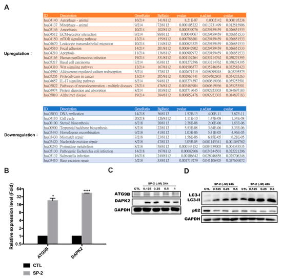To further investigate gene and signaling pathway regulation in response to SP-2, Next-generation sequencing (NGS) was performed to characterize differentially expressed genes upon SP-2 treatment. The functional enrichment analysis of the Kyoto Encyclopedia of Genes and Genomes (KEGG) pathways among gene clusters was also performed to identify any affected signaling pathways. We found that the autophagy pathway was upregulated in the SP-2-treated cells (Figure 4A, upper table). Meanwhile, the DNA replication, cell cycle, and steroid biosynthesis pathways were downregulated with SP-2 treatment (Figure 4A, lower table). We further validated the NGS data by performing an RT-qPCR and Western blotting to analyze some differentially expressed genes in the SP-2-treated RT-112 cells. Autophagy-related protein 9B (ATG9B) and death-associated protein kinase 2 (DAPK2) have been reported as a regulator of autophagy and a modulator of mTORC1 activity and the autophagy level, respectively [,]. We confirmed that SP-2 treatment induced the mRNA and the protein expression of ATG9B and DAPK2 (Figure 4B,C). Significant LC3-II formation and P62 degradation were also detected in the SP-2-treated RT-112 cells in a concentration-dependent manner (Figure 4D). DAPK2 induction and autophagy were also detected in the RT4 cells treated with SP-2 (Figure S1B). These data indicated that SP-2 activated the autophagy pathway in the BC cells.