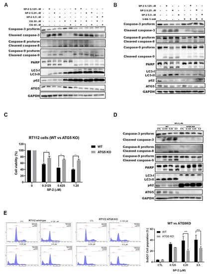 Knockout of ATG5 reduced SP-2-induced sub-G1 accumulation and apoptosis in RT-112 cells. (A,B) Inhibition of autophagy with either CQ (A) or 3-MA (B) reduced SP-2-induced apoptosis in RT-112 cells. The cells were treated with SP-2 for 48 h in the presence or absence of an autophagy inhibitor (CQ or 3-MA), and cell lysates were analyzed through Western blotting. (C–E) ATG5-knockout reduced SP-2-induced cytotoxicity (C), apoptosis (D), and accumulation in the sub-G1 phase (E) in RT-112 cells. Cells were treated with indicated concentrations of SP-2 for 48 h, and cell viability (C) and cell cycle distribution (E) were determined with MTT assay and through flow cytometry, respectively. * p < 0.05, ** p < 0.01, and *** p < 0.001. Cell lysates from 48 h SP-2 treatment were analyzed through Western blotting (D).
