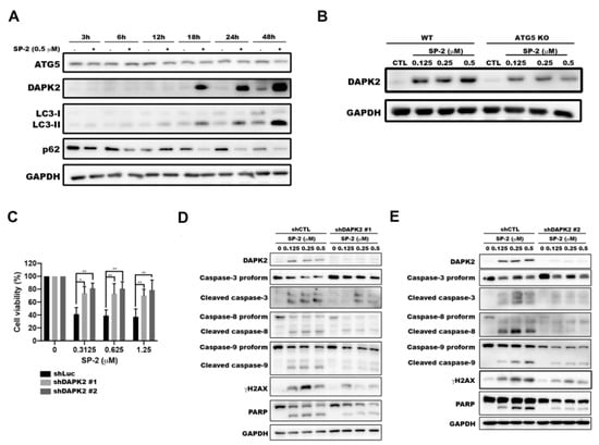 DAPK2 potentiated SP-2-induced apoptosis in RT-112 cells. (A) SP-2 induced autophagy and the DAPK2 level in a time-dependent manner. (B) ATG5-knockout reduced the upregulation of DAPK2 in RT-112 cells. Cells were treated with different concentrations of SP-2 for 48 h, and cell lysates were immunoblotted using the indicated antibodies. (C–E) DAPK2-knockdown protected SP-2-induced cytotoxicity (C) and apoptosis (D,E) in RT-112 cells. Cells were treated with different concentrations of SP-2 for 48 h, and cell viability and apoptosis were determined with MTT assay and through Western blotting, respectively. * p < 0.05 and ** p < 0.01.