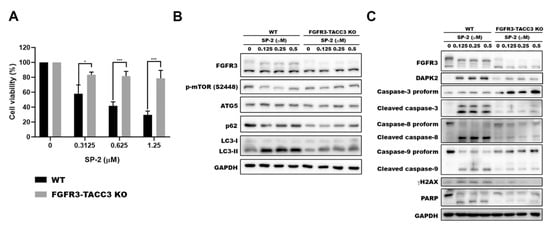 FGFR3-TACC3 fusion was essential to SP-2-induced autophagy and apoptosis in RT-112 cells. (A) FGFR3-TACC3 knockout significantly reversed SP-2-reduced cell viability. Cells were treated with different concentrations of SP-2 for 48 h, and cell viability was determined with MTT assay. * p < 0.05 and *** p < 0.001. (B) FGFR3-TACC3 knockout decreased SP-2-indcued autophagy. Cells were treated with different concentrations of SP-2 for 48 h, and cell lysates were immunoblotted using the indicated antibodies. (C) FGFR3-TACC3 knockout protected RT-112 cells from SP-2-induced apoptosis. Cells were treated with different concentrations of SP-2 for 48 h, and cell lysates were immunoblotted using the indicated antibodies.