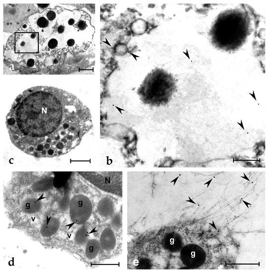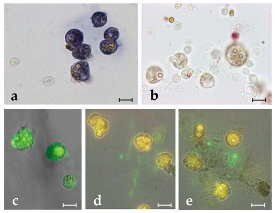 - Ballarin, L.; Cima, F. Cytochemical properties of Botryllus schlosseri haemocytes: Indications for morpho-functional characterisation. Eur. J. Histochem. 2005, 49, 255–264. [Google Scholar]